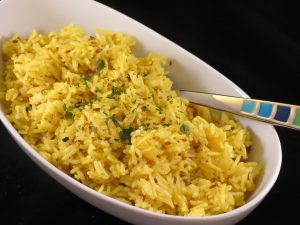 – Adjuk hozzá a rizs, a vizet, a kurkumát és a sót.