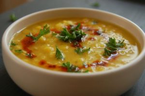 – Forraljuk fel a vizet öntsük bele a babot, a krumplit, a babér levelet és a kurkumát, majd közepes hőfokon főzzük.
